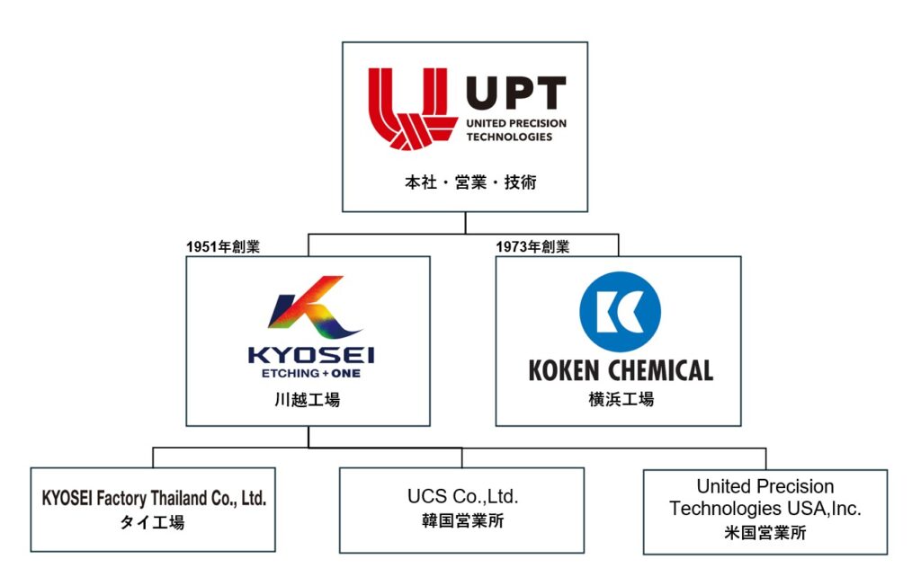 | 2017 | 北米地域におけるマーケティング機能及び販売を目的として KYOSEI USA、INC.を設立。米国カリフォルニア大学アーバイン校へ研究補助。 | UPTグループの一員となる。エッチングラインを増設。 | 商号をUPTへ変更。”エッチング+ONE”としてグループオリジナル製品を発表。 コーケン化学(株)を連結子会社化。 |