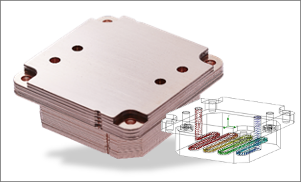 A cooling device with channels for coolant to flow through, used to help cool down electronic equipment and semiconductor devices.